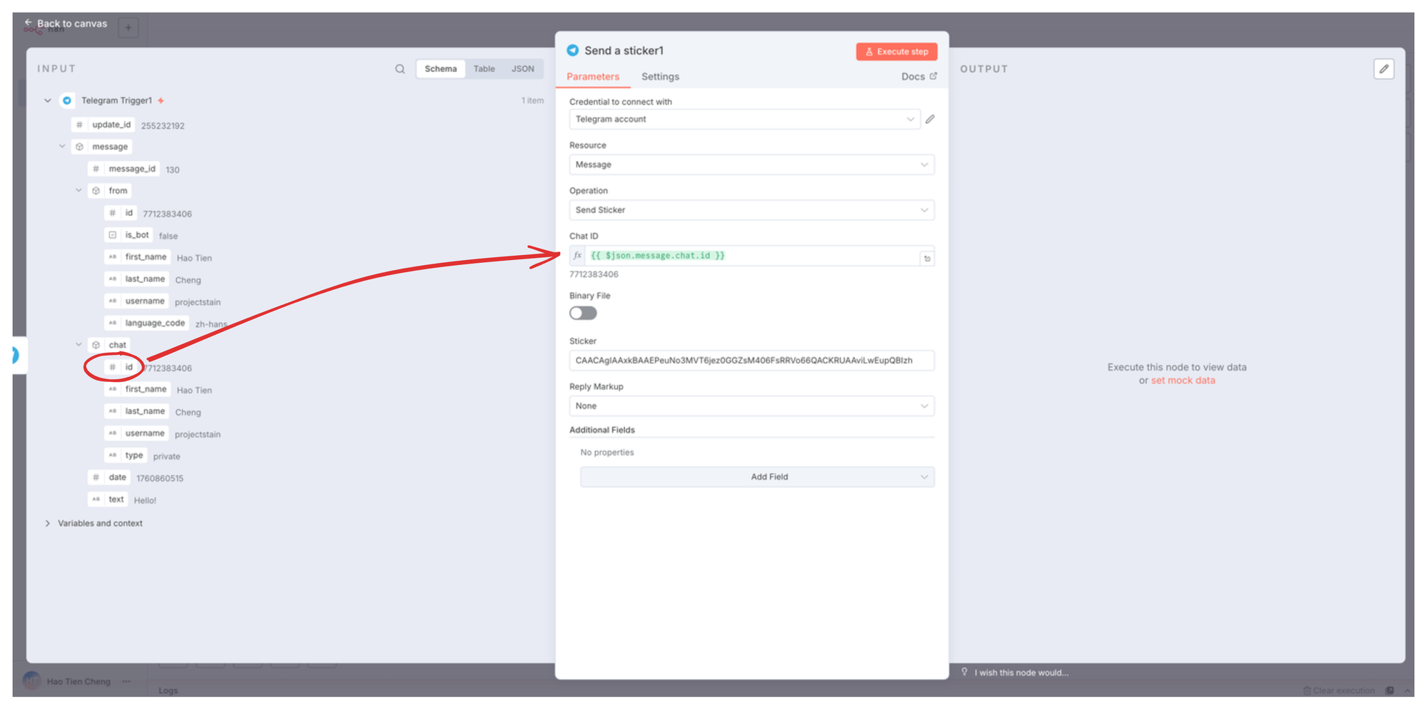 接下來我們再建立一個 Telegram Send a Sticker 節點,並且將對應的 Chat ID 拖拉到指定欄位。