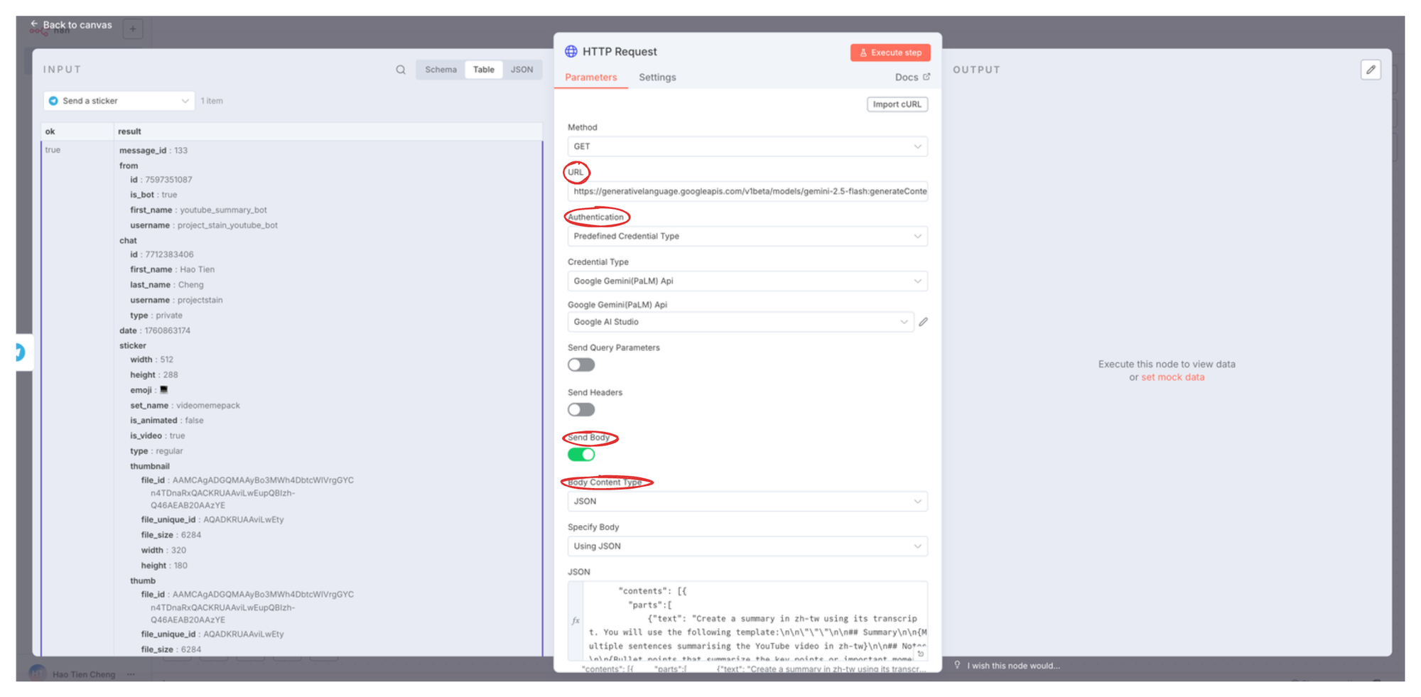 接下來的步驟會比較複雜,由於目前 n8n 官方的 Gemini 節點還沒辦法直接取得 youtube 轉錄稿的功能,我們將直接使用 API Request 的方式跟 Gemini 互動。