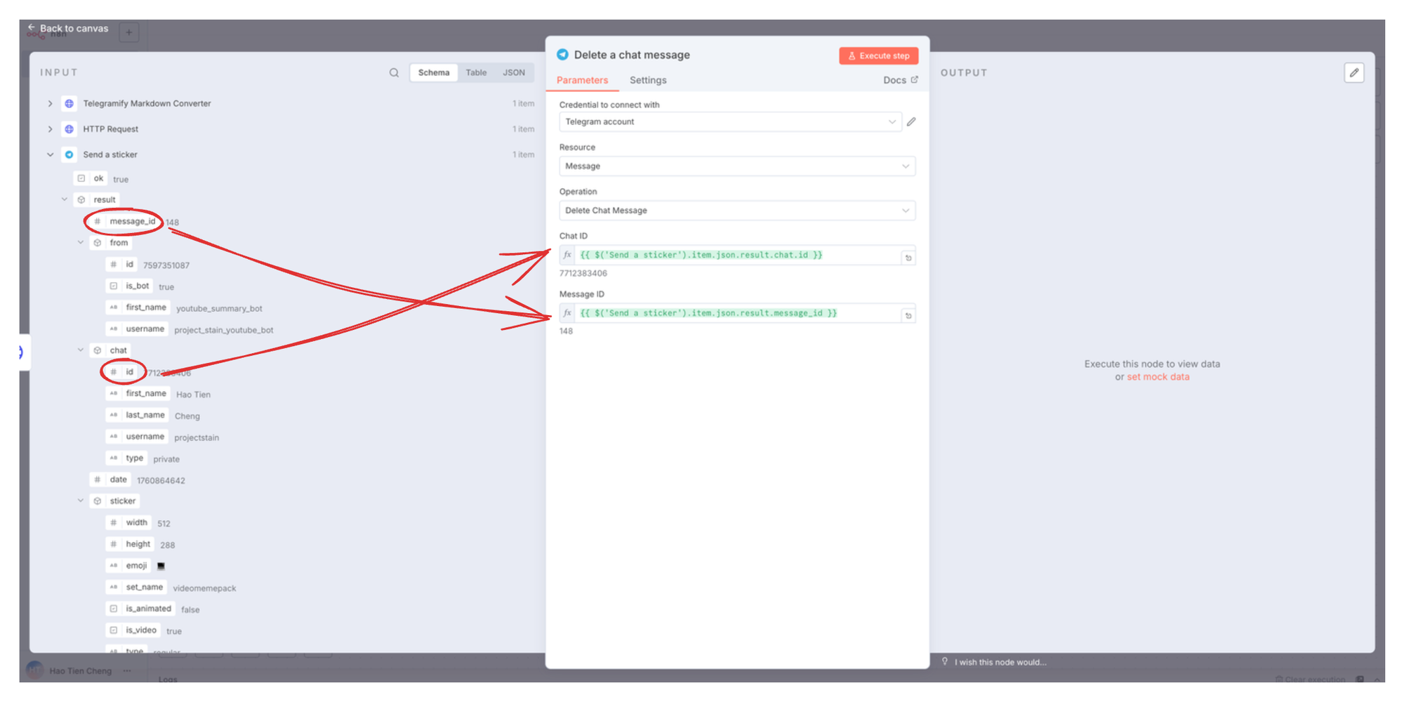 chat_id 、message_id 拉到對應欄位 最後的步驟: