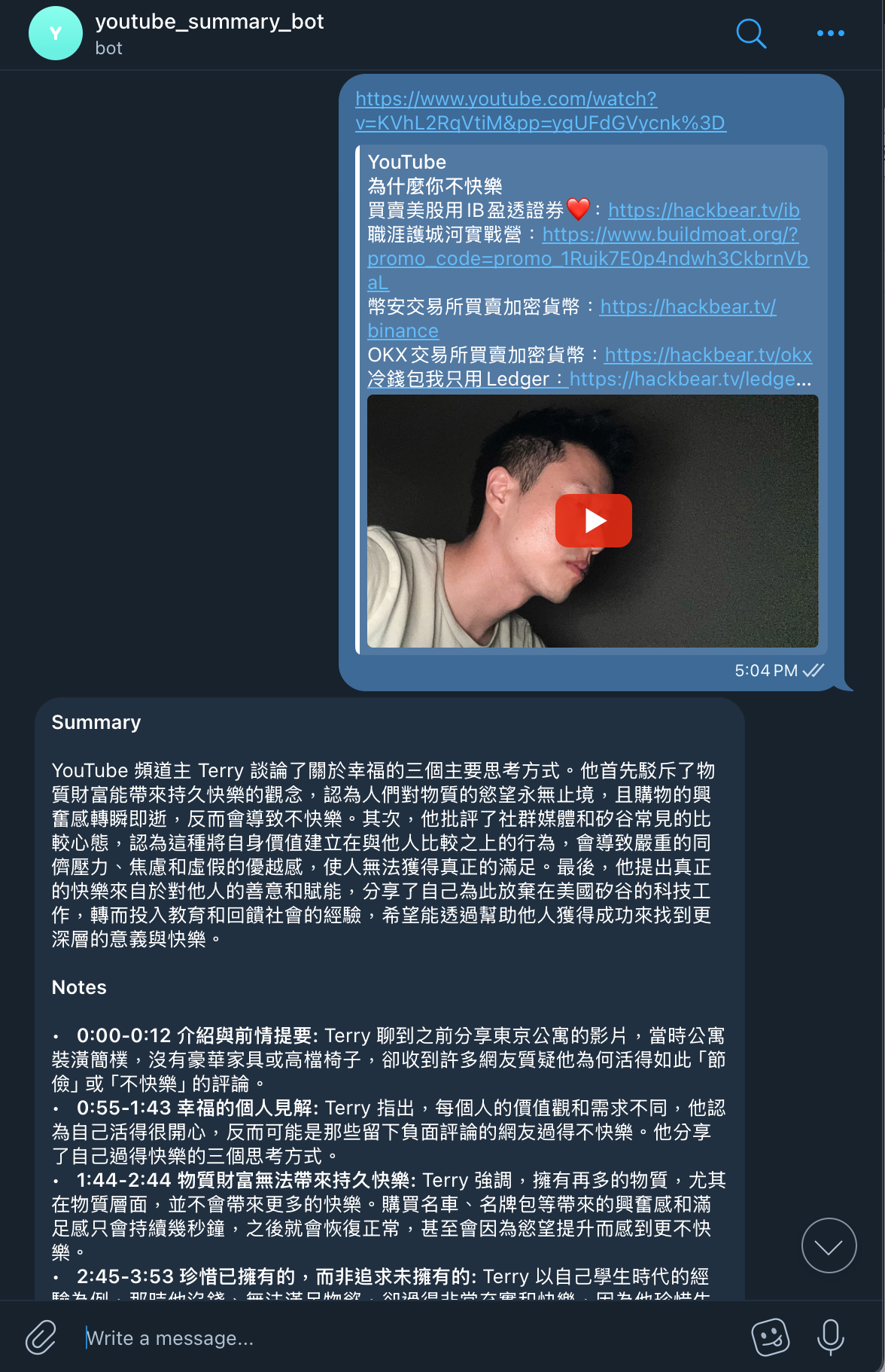 隨時將想摘要的影片丟入 telegram 中,無論是手機版或是電腦版都能正確執行。