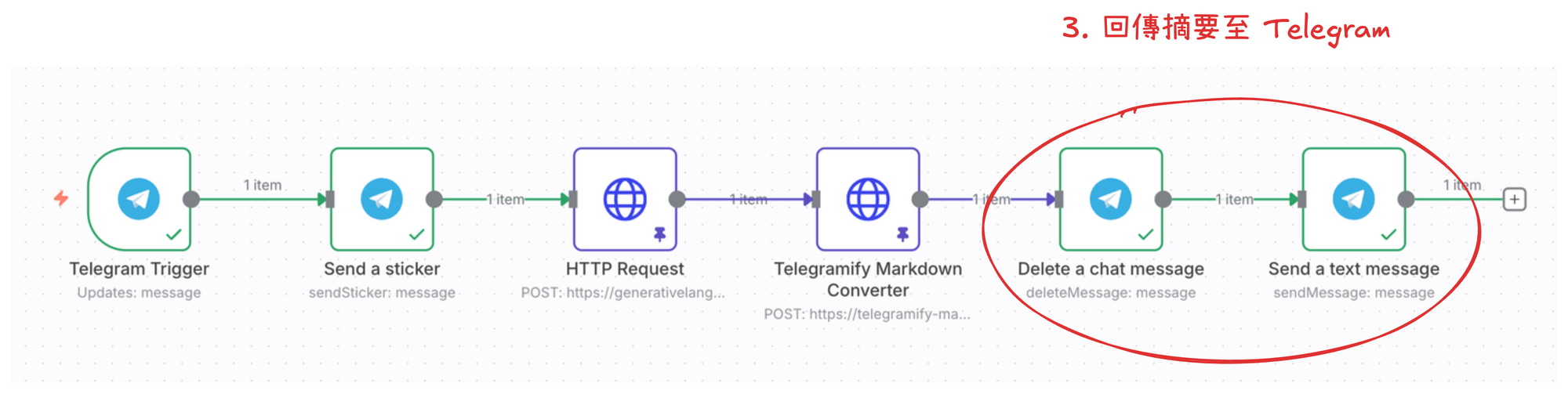 到這裡其實已經算大功告成了,接下來我們只要將總結摘要回傳到 Telegram,就成功完成這個 workflow。