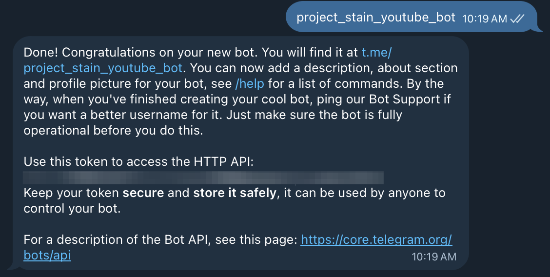 這邊我們可以直接傳送一個 youtube 連結給 telegram,方便後續直接測試使用。