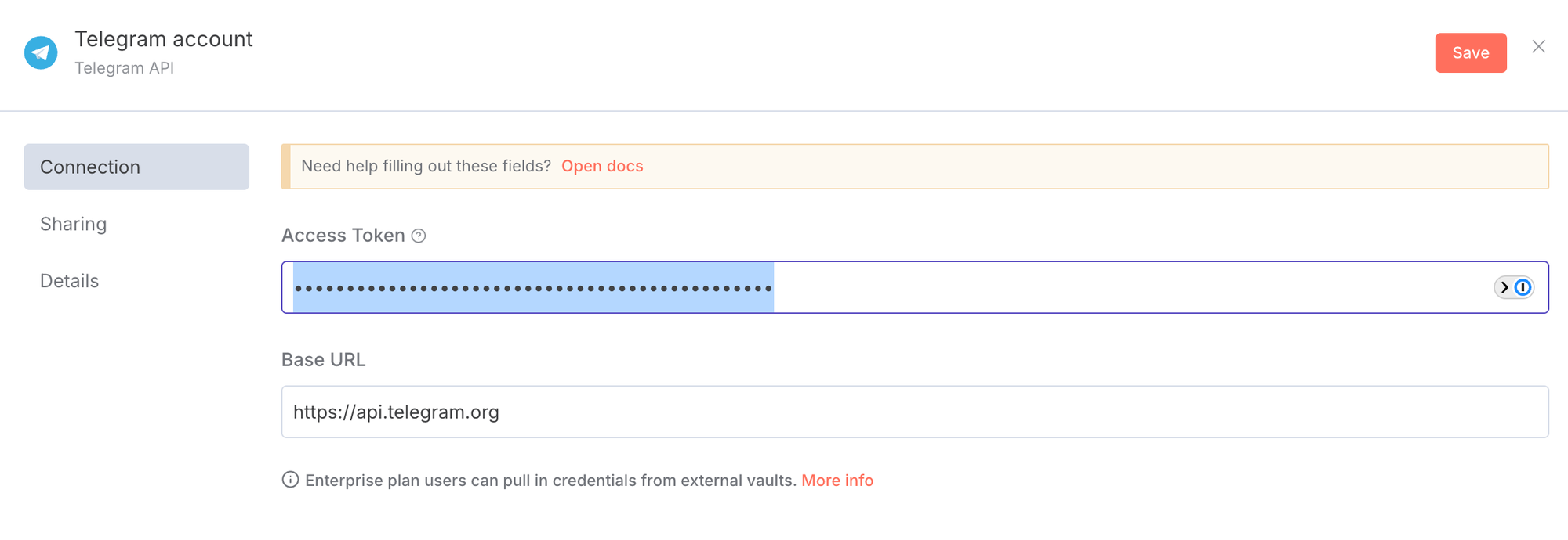 下個步驟我們將把 Credential 新增到 n8n 的 telegram 節點。